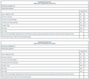 Ingredientes: Óleo de peixe EE; Cápsula: água purificada, gelificante (gelatina) e umectante (glicerol). NÃO CONTÉM GLÚTEN. ALÉRGICOS: CONTÉM 1 DERIVADOS DE PEIXE. PODE CONTER DERIVADOS DE SOJA.